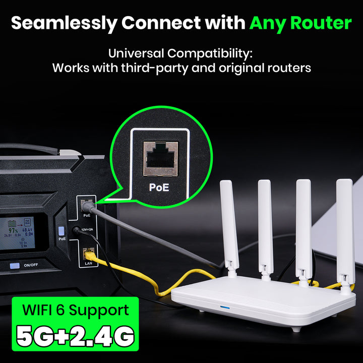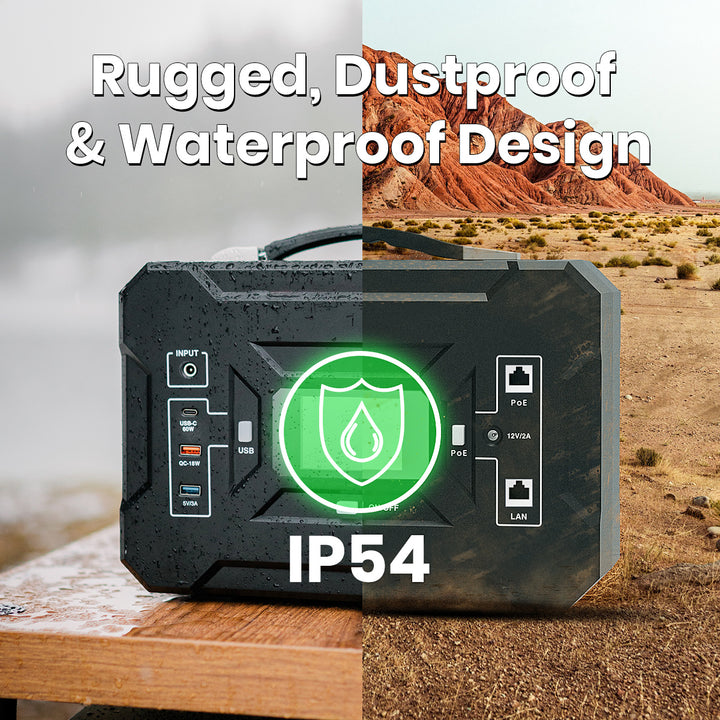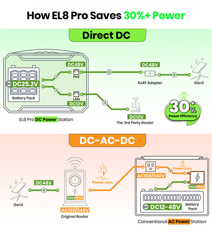 Starlink draws high power and typical outdoor solutions are heavy, inefficient, or fragile in bad weather. EL8 Pro solves that: it's compact, Starlink‑optimized, and eliminates inverter losses so you get longer runtime from a smaller pack — with safe, selectable PoE voltages for the three Starlink models and an easy plug‑and‑play setup.