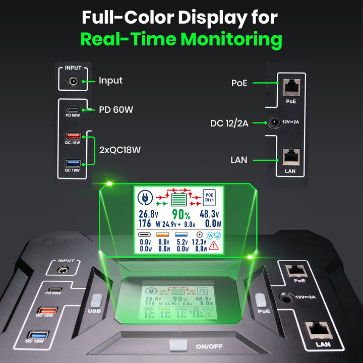 | Output | DC5521 12V/2A, 2*USB-A QC3.0 18W, USB-C PD 60W, PoE Port, LAN Port |