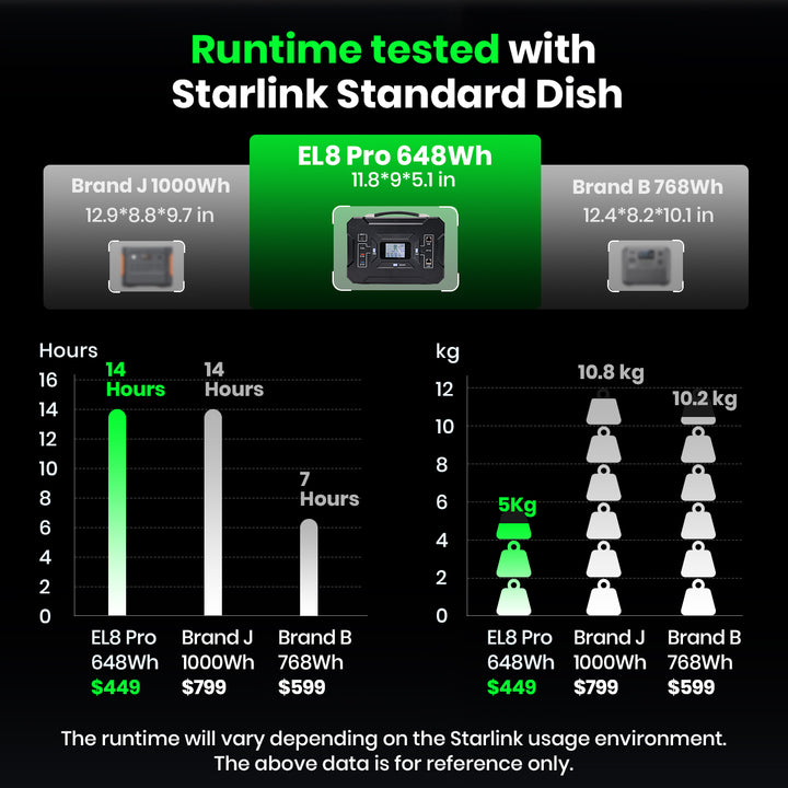 Runtime depends on the Starlink model and network activity. Typically, the 648Wh version powers Starlink for 6–10 hours (based on average use).